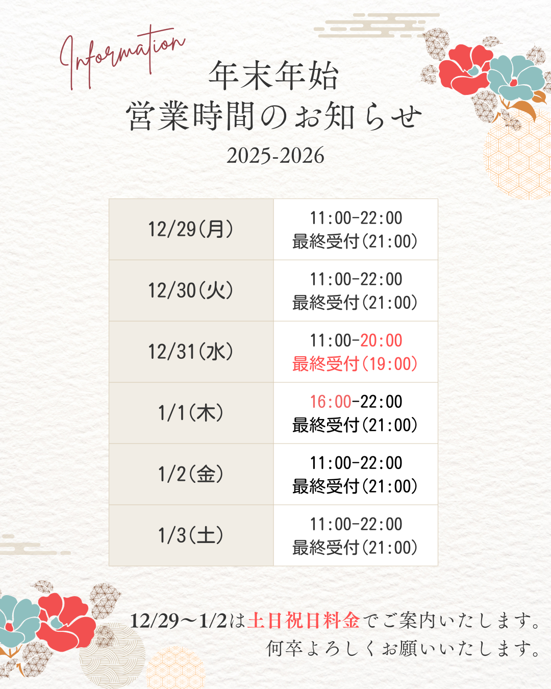 12/30(火)11:00~22:00(最終受付21:00)