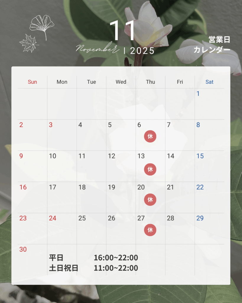 11月の営業スケジュール 2025年11月7日 最終更新日時 : 2025年11月7日 villafumoto 朝晩がぐっと冷え込むようになりましたね。あたたかいお湯にゆっくり浸かって、心と体を整える季節がやってきました♨ 今月もどうぞよろしくお願いいたします。